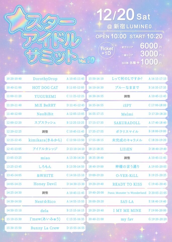 スターアイドルサミットvol.102025.12.20(土)at 新宿LUMINE0Next☆Rico 【イベントページ】 paylove.org/events/1553 【イベント概要】 ■イベント名:スターアイドルサミット vol.10 ■日程:2025年 12月20日(土) ■開場/開演:10:00/10:20 ■会場:新宿LUMINE0 【チケット】 ■通常エリアチケット:3,000円 ■前方エリアチケット:6,000円 ■当日チケット:各種+1,000円 ※各種+別途1ドリンク ■再入場:可能(無料)