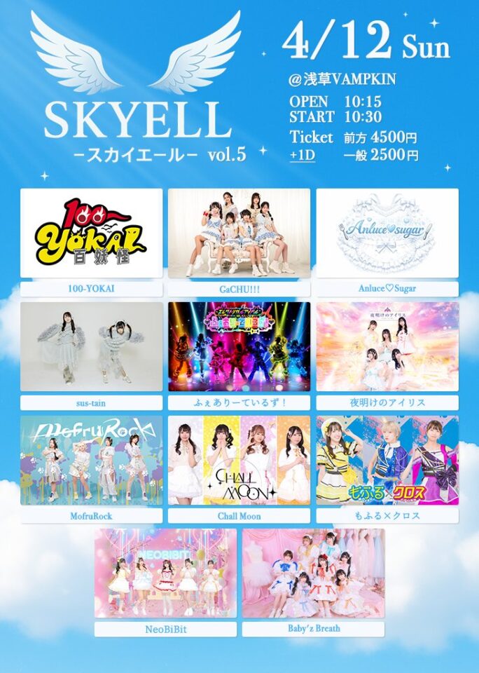 SKYELL -スカイエール- vol.52026.04.12(日)at 浅草VAMPKINBaby'z Breath SKYELL -スカイエール- vol.5 ■日程:2026年 4月12日(日) ■開場/開演:10:15/10:30 ■会場:浅草VAMPKIN 【チケット】 ■通常エリアチケット:2,500円 ■前方エリアチケット:4,500円 ■当日チケット:各種+1,000円 ※各種+1ドリンク paylove.org/events/1644 ■再入場:可能(無料)