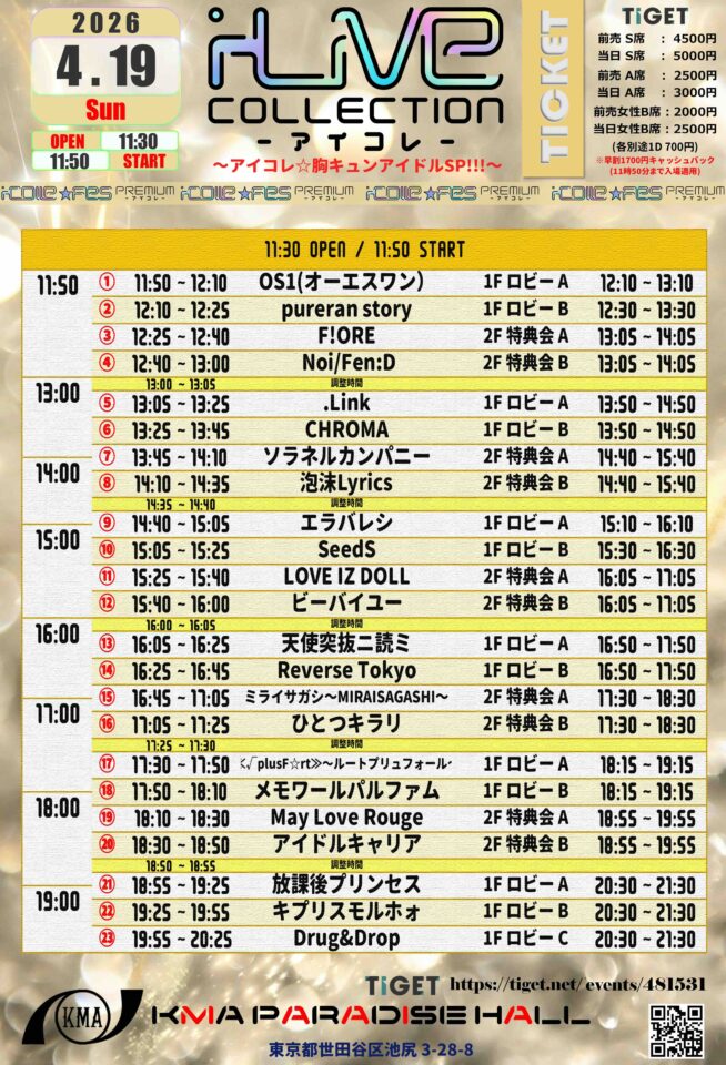 ● 開演時間や出演時間の変更、出演予定グループの変更、ならびに出演者様の出演見合わせ及び出演者の欠席などによる払い戻しはございません。