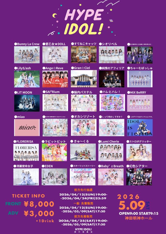 出演:Bunny La Crew / 月に足跡を残した少女達は一体何を見たのか… / 愛乙女★DOLL / すてねこキャッツ / シオリベル / LilyS/ash / Ange☆Reve / Gran☆Ciel / 純情のアフィリア / ちゃーむぽっしゅ / LIT MOON / SAI²Rium / 脳内パステル / ハレとハレ! / / MiX BeRRY / miao / 恋に落ちる確率は限りなく低いが0じゃない / オカシリゾート / Lって何のLですか? / このアイドルはフィクションです。 / FLORERISA / ラビットビット / きゅ〜くる / Lumi Cherie / ストロボグリッター / 清麗使命女子 / EDEN / スターリットストーリー / Baby’z Breath / 幻色シアター
